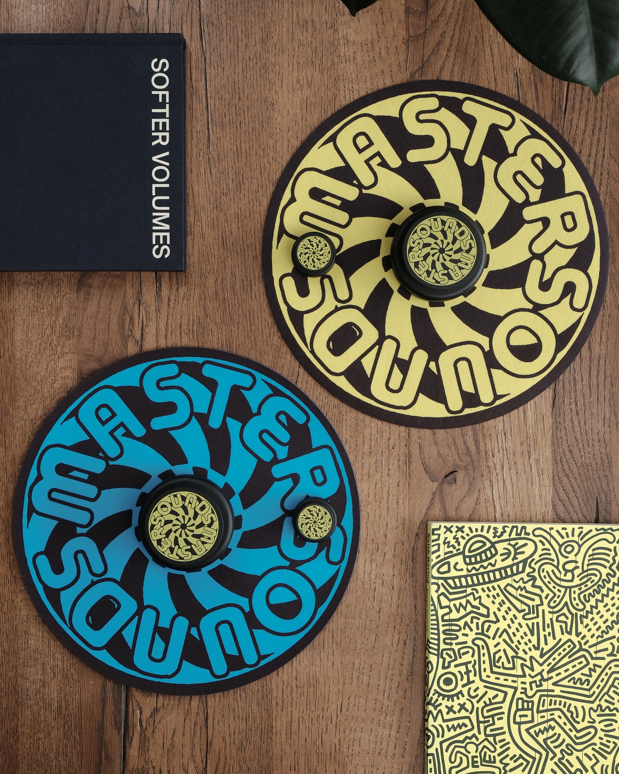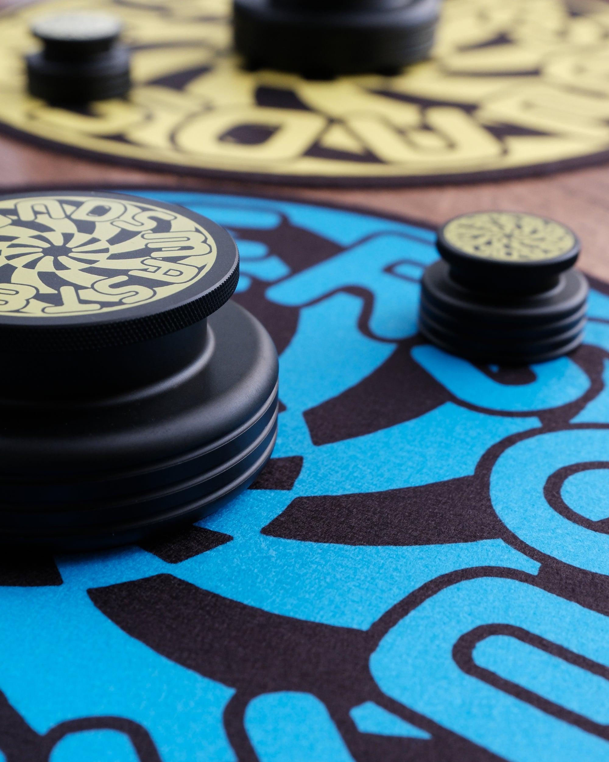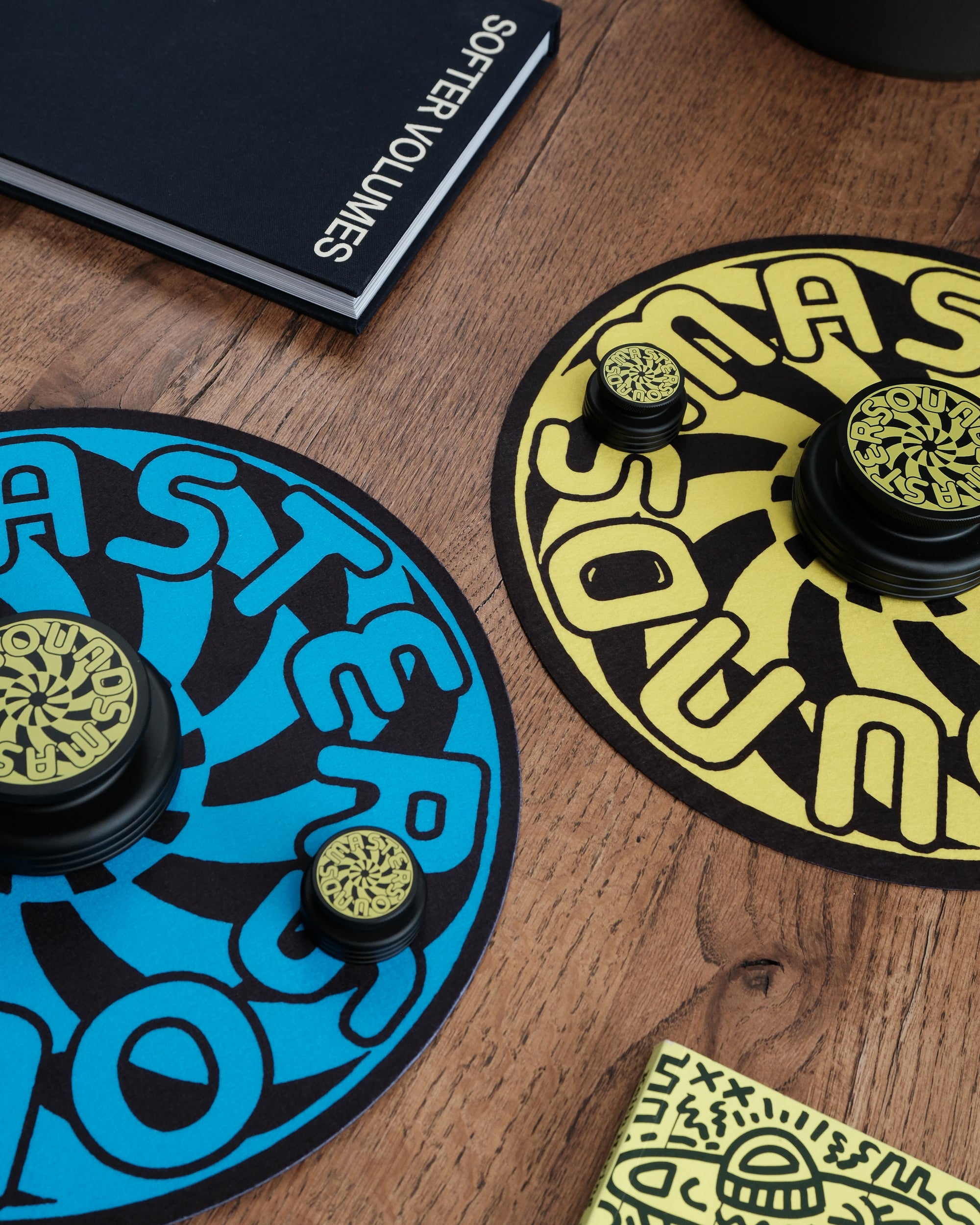 Our Turbine edition set of audio accessories are adorned with a bold screen printed yellow graphic. Hand-numbered box & edition tag. 50 pairs for the world. When spinning, the turbine graphic gives an optical illusion. Flip the Mat over for a complimentary blue colour-way.